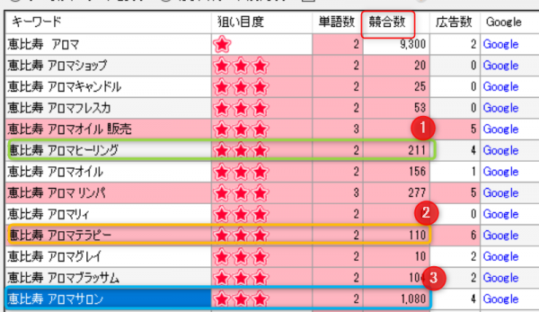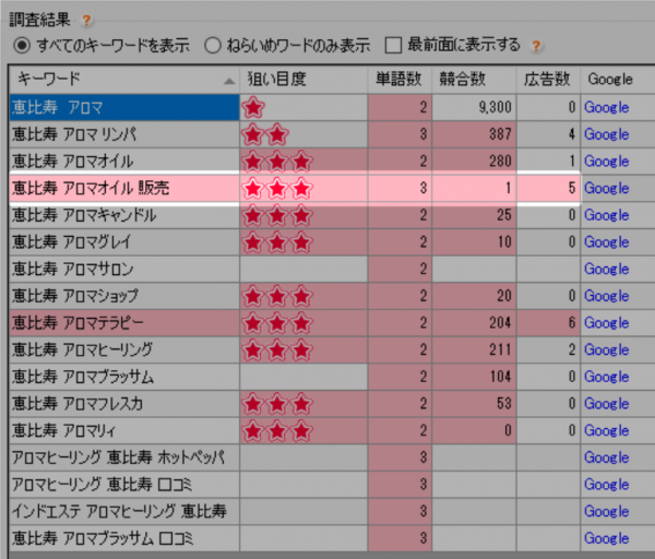 ここで初級者レベルのSEO対策業者はライバルのいないキーワードに目を向けるのですが、宣伝と売り上げ増加ということまで目を向ければ、間違いなく「アロマオイル+販売」というキーワードに目が留まるはずなのです。