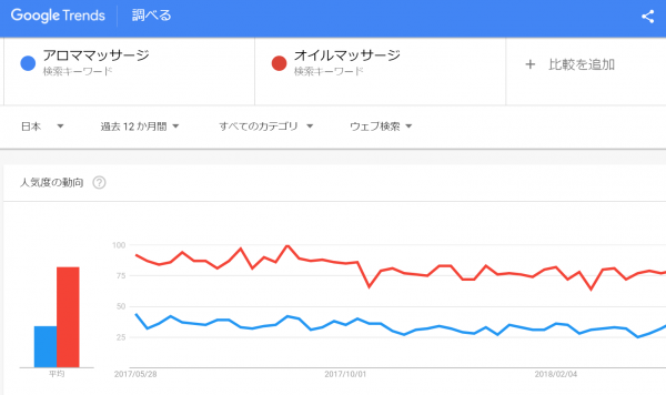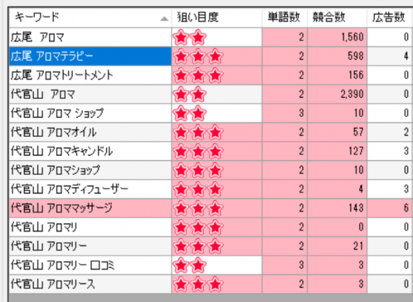 さらに隣の地域、広尾や代官山も調べると、代官山のアロママッサージは競合が143と少なく、比較的キーワードが狙いやすいことに気づきます。