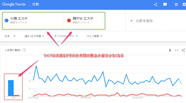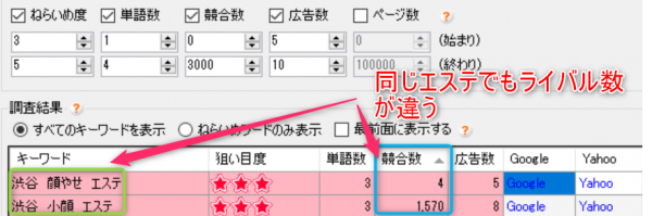ちょっとした5000円程度のツールは必要ですが、きちんと調べると同じエステでも「渋谷+顔やせ+エステ」「渋谷+小顔+エステ」ではライバルの数が数百倍も違います。